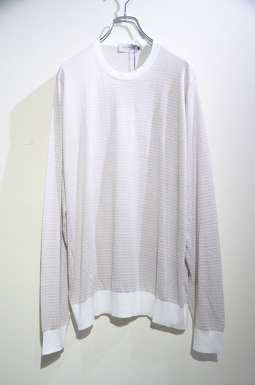 ベージュベースのボディにうっすらと細いマルチボーダーが引かれた豊かな表情を備えたロングスリーブニット。生地感も非常に軽く薄手のため、春夏シーズンに最適な1枚です。