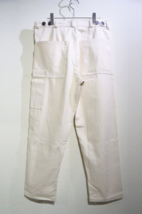 フロントのスクエアステッチのポケット、左腿片側に重なるようにデザインされたパッチポケットが設けられたワークトラザーズならではなディティールを備えたボトムスウェア。