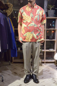こちらも先の1枚と同じく、リバースプリントによる裏返しテキスタイルからの1枚。襟元はアロハではあまり見かけないボタンダウン。そしてボタンダウンの襟周りになるとプルオーバーシャツになります。