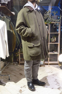 オーバーコートらしいゆったりとしたシルエットライン。前作と異なる点として、襟元のチンストラップが備わる個体となり、スタンドカラーの着回しも楽しめる一枚です。