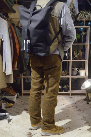 アイテムを出し入れする開口部はロールトップ状に丸められる仕様となっており、浸水防止の役割を果たします。ファブリックが持つ防水性と、デザインアイデアを生かした作りこみが成されています。