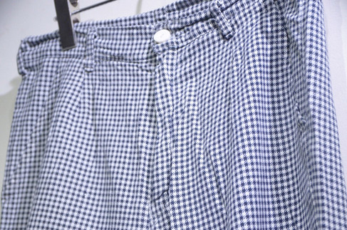 柄模様は白黒の細かなチェックプリントパターンですが、遠目で見ると千鳥格子柄にも見える独特なパターニングです。フロントはトップボタンとジップフライによる開閉機構を備え、バックポケットは片側一つだけとなるユーロワークパンツ特有のデザインです。