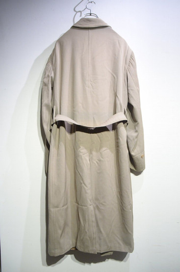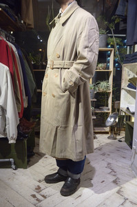 年代経過に伴い、右襟、裾まわりに2cm程度の染みや、裏地にも一部変色が見受けられますが、ボタンやベルトの欠損もなく、表地には虫食いなどもありません。40年代の製造品としてみると非常に綺麗なGOOD CONDITIONと評せられる個体です。
