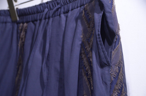 深めネイビーの茶金の刺繍が映える、ラグジュアリーな出で立ち。イージーパンツですが見栄えは高級感あふれるドレスパンツのような風合いです。